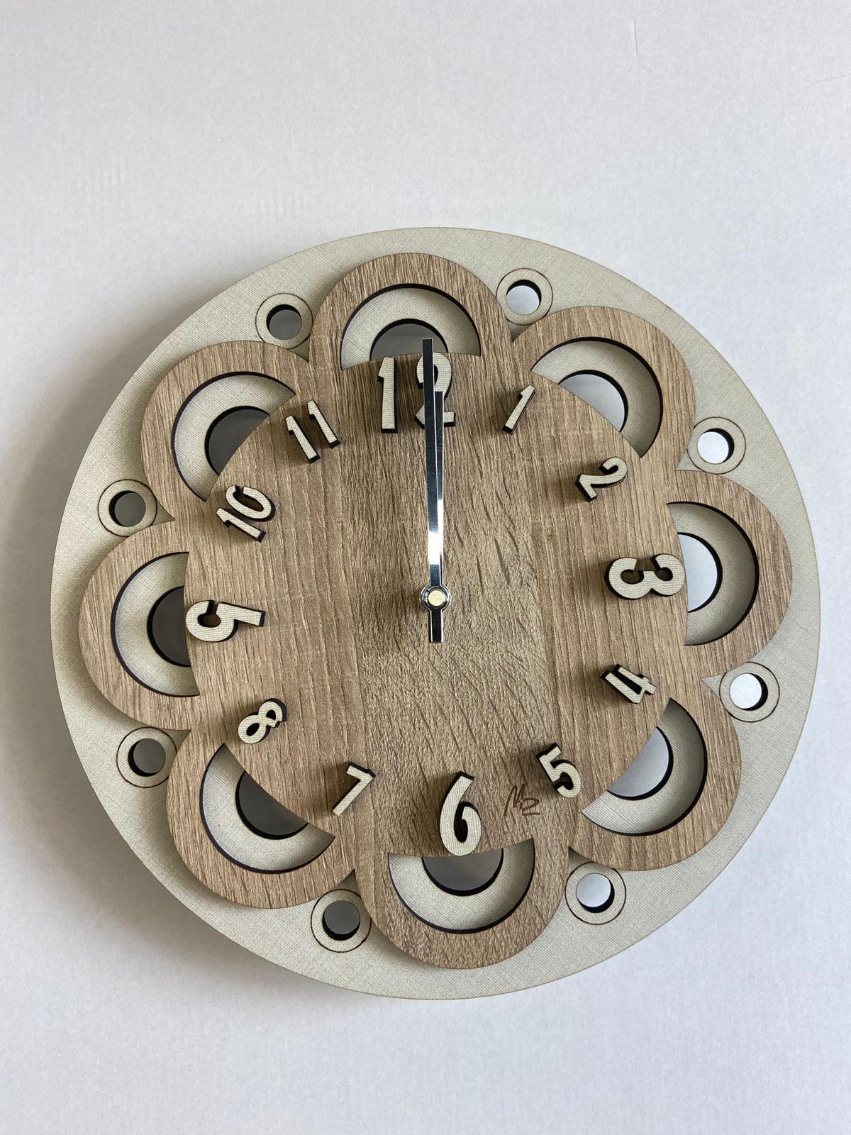 Elegante orologio tondo in legno con numeri a rilievo e lancette in metallo.